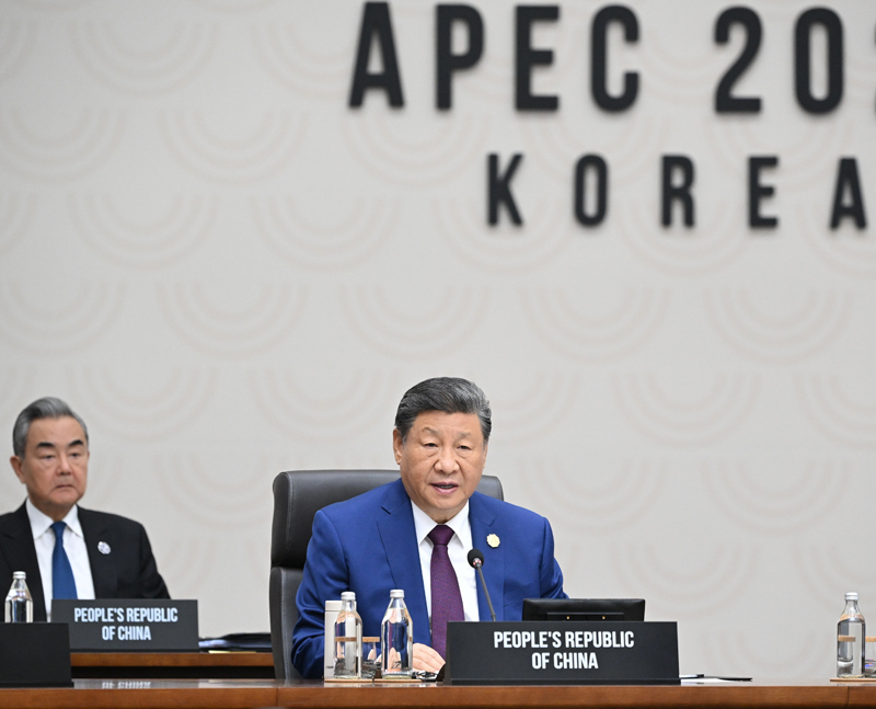 當?shù)貢r間11月1日上午,國家主席習近平在韓國慶州出席亞太經(jīng)合組織第三十二次領導人非正式會議第二階段會議,并發(fā)表題為《共同開創(chuàng)可持續(xù)的美好明天》的重要講話。新華社記者 謝環(huán)馳 攝
